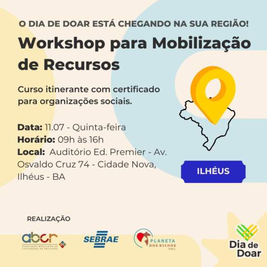 No dia 11 de julho, quinta-feira, Ilhéus vai receber um workshop intensivo focado em capacitar profissionais do terceiro setor na mobilização de recursos. O evento é gratuito e acontece a partir das 09h, no Auditório do Ed. Premier, com realização da Associação Brasileira de Captadores de Recursos e em parceria com o SEBRAE e a ONG Planeta dos Bichos. Ministrado pela líder do Dia de Doar, Carol Farias, uma referência em ativismo pela cultura de doação, o encontro tem como público-alvo pessoas que atuam em organizações de impacto social e buscam fortalecê-las na região.