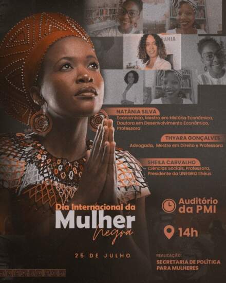 No próximo dia 25 de julho, em comemoração ao Dia Internacional da Mulher Negra, a Prefeitura de Ilhéus, por meio da Secretaria de Políticas para Mulheres, realiza um evento especial que reúne três mulheres negras representativas da sociedade, para compartilhar suas experiências, vivências e trajetórias. O encontro acontece no Auditório da Prefeitura Municipal, a partir das 14 horas, e conta com a presença de Natânia Silva (economista, mestra em História Econômica e doutora em Desenvolvimento Econômico e professora na UESC); Thyara Gonçalves (advogada, mestre em Direito, presidente da Comissão de Criminalistas da Subseção OAB/Itabuna e professora na Faculdade de Ilhéus) e Sheila Carvalho (cientista social, professora, especialista em Educação e Gestão Cultura, presidente da UNEGRO/Ilhéus).