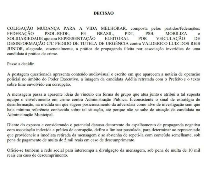 Na terceira decisão contra o candidato do União Brasil, proferida hoje (30), a Justiça Eleitoral reconheceu que dois vídeos de Valderico trazem falsa acusação de apropriação de recursos públicos e que o emprego do termo “danadinha” tem cunho de imputação caluniosa de crime. Por isso, determinou a imediata exclusão da propaganda eleitoral negativa e a proibição de divulgação de conteúdo semelhante, sob pena de pagamento de multa de 5 mil reais em caso de descumprimento.
