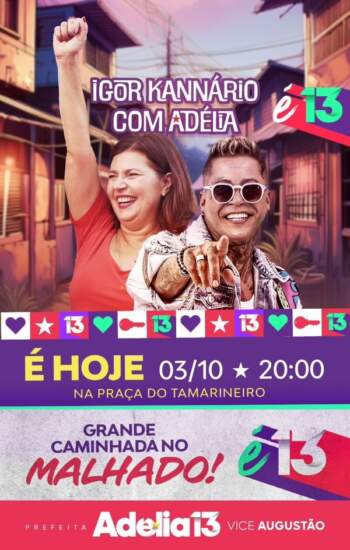 A caminhada do cantor Igor Kannário com a candidata a prefeita Adélia (13) foi adiada para as 20h desta quinta-feira (3), com saída da Praça do Tamarineiro, no Malhado, em Ilhéus. A mudança de horário atende a um pedido da produção do artista, em razão de outros compromissos de sua agenda.