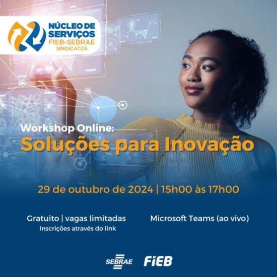 Nesta terça-feira (29), das 15h às 17h, empresários e gestores de indústrias poderão participar do workshop online “Soluções para Inovação”, uma iniciativa conjunta do Sebrae, Núcleo de Serviços da FIEB, Sindicatos, com apoio da FINEP, IEL, e SENAI Cimatec. O evento será transmitido pela plataforma Microsoft Teams e as inscrições são gratuitas, podendo ser realizadas pelo link.