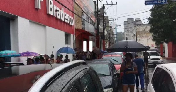 Chuva e aglomeração na porta do Bradesco em Ilhéus
