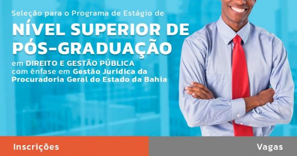 São 3 vagas para Ilhéus e mais 36 para outras partes da Bahia A Procuradoria Geral do Estado da Bahia, abre inscrições para o Exame de Seleção de Candidatos ao Programa de Estágio de Pós-Graduação em Direito (PEPGD) e ao Programa de Estágio de Pós-Graduação em Gestão Pública, com ênfase ...