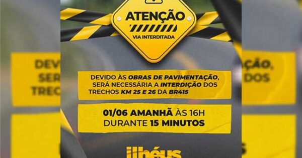 O trânsito será interditado às 16 horas, no trecho entre os quilômetros 25 e 26 O Consórcio SVC/PAVISERVICE informa que o trânsito na BR-415 será interditado às 16 horas desta quinta-feira (1º), no trecho entre os quilômetros 25 e 26. A interdição é necessária para execução do desmonte de rocha, ...Carros e motos não poderão circular na 2 de julho, sábado, das 17 às ...