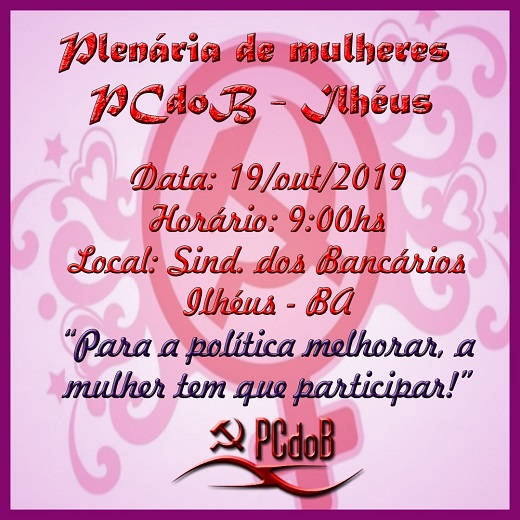 O PCdoB de Ilhéus realiza no próximo sábado (19) , a partir das 9 horas, a sua Plenária Municipal das Mulheres. Essa reunião faz parte do processo de realização da Conferência Municipal do Partido, e tem como objetivo debater a política nacional, estadual e municipal, com foco no papel das ...Ilhéus: Vapt Vupt acontece nesse sábado (6)