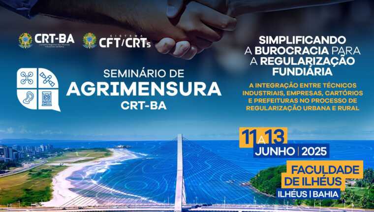 O Conselho Regional dos Técnicos Industriais da Bahia (CRT-BA) promoverá, de 11 a 13 de julho, o 3º Seminário de Agrimensura, na Faculdade de Ilhéus. O evento, com acesso inteiramente gratuito, reunirá profissionais de renome nacional para debater as aplicações da agrimensura em temas fundamentais para o desenvolvimento urbano, rural e ambiental do Brasil.