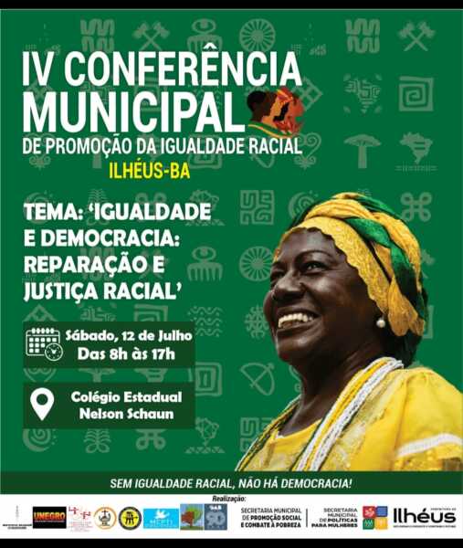 A Prefeitura de Ilhéus, por meio da Secretaria Municipal de Promoção Social e Combate à Pobreza e da Secretaria de Políticas para Mulheres, em parceria com os Coletivos de Militância Negra de Ilhéus-BA, realiza, neste sábado (12), a IV Conferência Municipal de Promoção da Igualdade Racial.