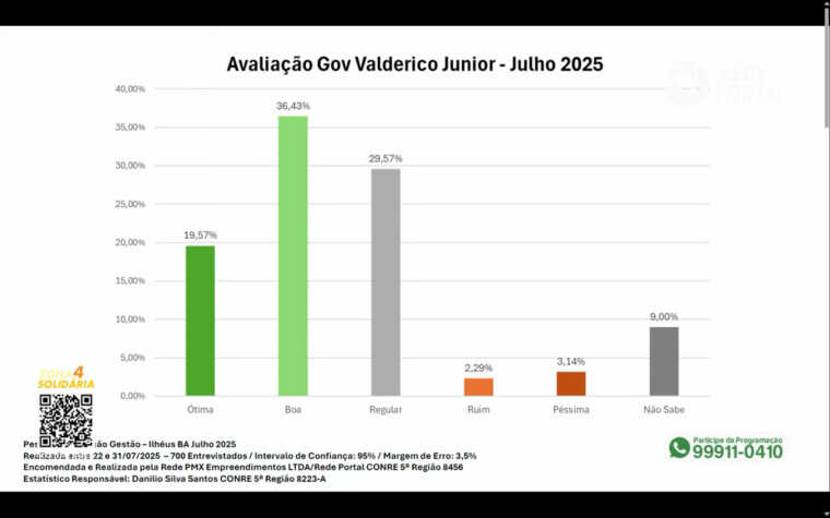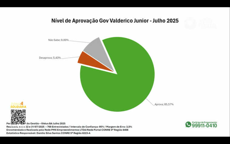 O governo do Prefeito Valderico Junior e da Vice-Prefeita Wanessa Gedeon tem 85,57% de aprovação, conforme pesquisa encomendada e realizada pela Rede Portal. Os dados foram divulgados nesta segunda-feira (04) e refletem a avaliação da população sobre os primeiros sete meses da gestão municipal.